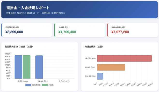 締め日ごとの請求額・繰越額・未入金リスト・入金期日を自動集計。6パターンある締め日をまとめて管理し、「今月末にいくら入るか」を月初から経営者が把握できます。回収遅延リスクのある取引先への対応も早くなります。