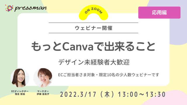 インフォメーション 法人ECご担当様向け「もっとCanvaで出来ること」ウェビナー開催のお知らせ 2022.03.11 落合 悠加 https://www.pressman.ne.jp/wp-content/uploads/2020/10/pressman-logo.png 株式会社プレスマン